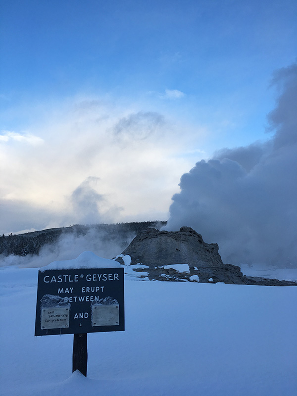 キャスルガイザー(Castle Geyser)は高さ約18~27mまで噴き上がる間欠泉で約14時間の間隔で大きく噴出する。噴き出し口は地下の熱水から生成されるシリカを含む層が積み重り、イエローストーン国立公園に大小たくさんある間欠泉の中でも特徴的で存在感のある間欠泉の1つである。近くのトレイルを歩いている時に偶然に噴き出す時間でしたので、幸運にも噴き出しているキャッスルガイザーを見ることができました。